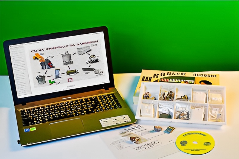 Образцы пронумерованы и помещены в коробку с ячейками. Комплектуются ламинированным вкладышем, содержащим информацию о свойствах, производстве и применении алюминия.