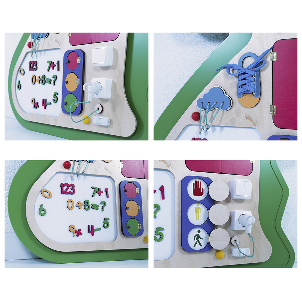 Главная задача бизибордов: помочь детям безопасно освоить предметы быта (защелки, крепления, механизмы, переключатели, розетки). На упрощенных тренажерах с привлекательными рисунками дети развивают мелкую моторику, оттачивают мастерство, чтобы в дальнейшем применить полученный навык на практике.