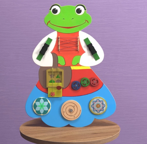 Бизиборд в виде лягушки - одна из моделей, которая крепится к стене, это дидактическое приспособление с игровым уклоном и с высокой игровой ценностью для детей от 1 года. Основа изготовлена в виде фигуры Лягушки-квакушки из русской народной сказки, на которой размещены разнообразные приспособления для детской игры. Все края закруглены и обработаны по специальной технологии, что гарантирует безопасность в использовании даже самыми маленькими детками.