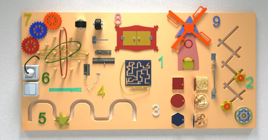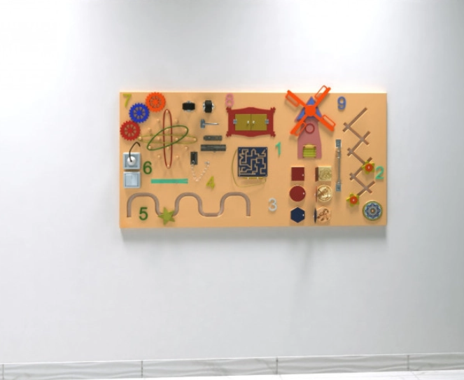 Бизипанель – это оптимальный симбиоз настенной игровой панели и бизиборда. Она больше, чем обычный бизиборд и более функциональна, чем стандартная настенная игровая панель, так как оборудована большим количеством игровых приспособлений. Основание представленной модели выполнена в спокойном персиковом цвете, а игровые элементы выделяются яркими акцентами.
