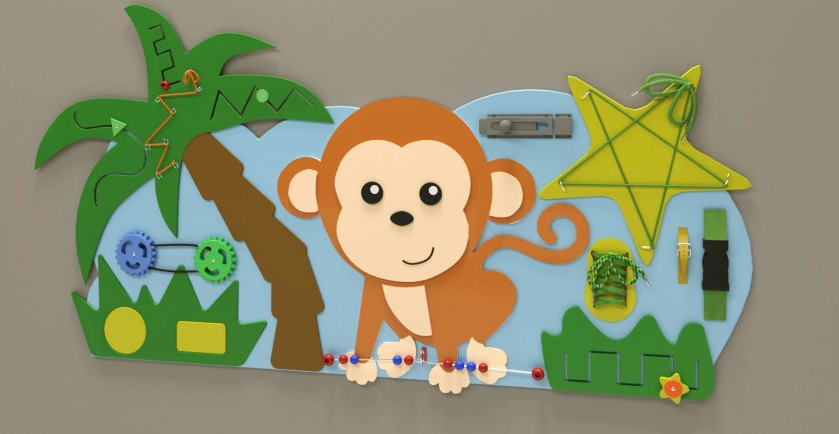 Настенная панель с обезьянкой — это компактный детский игровой модуль, основание его выполнено в виде нежно-голубого «облачка», на котором располагается озорная Обезьянка вместе с интересными приспособлениями для весёлой игры. Поверхность обработана специальным образом и имеет многослойное покрытие из экологически безопасных материалов.