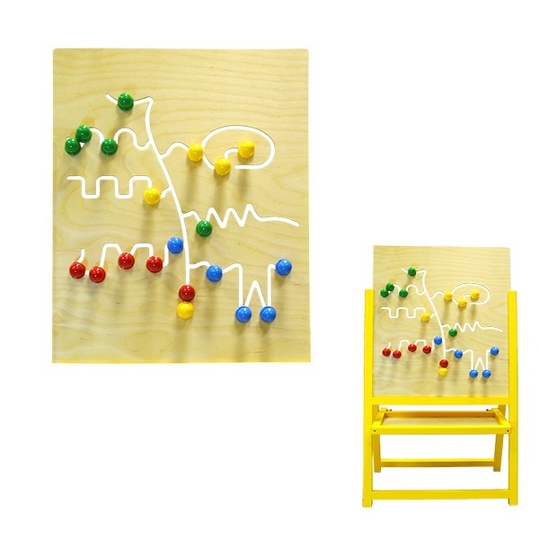 Двусторонняя неокрашенная панель размером 57 х 68 см. Панель с фигурными сквозными прорезями в виде волн, зигзагов, лабиринтов и т.д. Внутри прорезей помещаются 20 двойных подвижных цветных штырьков: 5 – красного, 5 – синего, 5 – зеленого, 5 – желтого цвета. Все штырьки имеют на противоположной стороне панели другую окраску.
